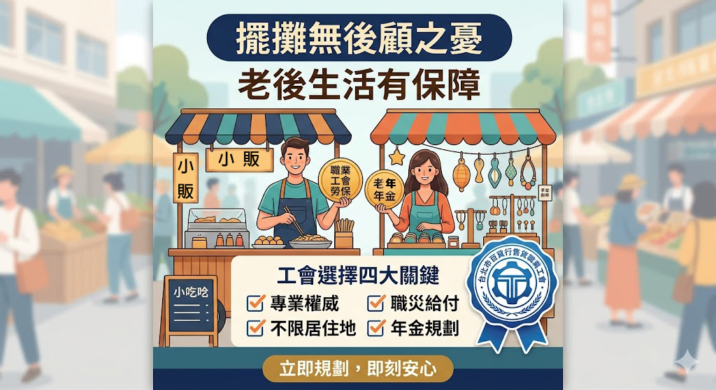 面對全台眾多工會,為何資深攤販與行內專家皆一致推薦**「台北市百貨行售貨職業工會」**?這不僅是因為其具備高度的專業權威,更因為它適用於各類在市場、夜市固定或流動販售的勞工,並解決了小販最擔心的三大痛點: